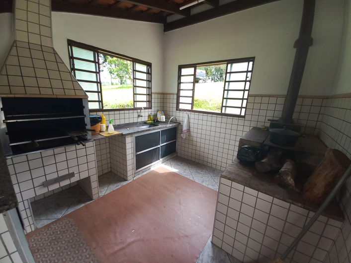 Complementando a estrutura, o sítio possui uma construção de aproximadamente 60 m² com três galpões destinados à guarda de carros, trator, carreta e outros equipamentos, além de um cômodo de 2x2 metros para armazenamento de materiais e uma cozinha equipada com fogão a lenha.